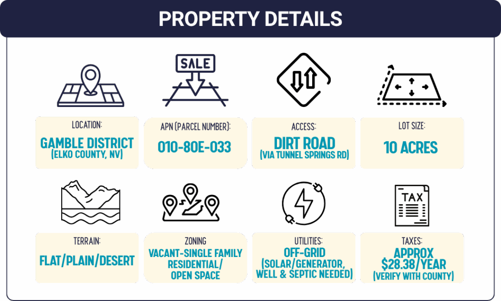 This 10-acre parcel in the Gamble District gives you wide-open desert land with flat terrain and quiet surroundings. The area has simple zoning, no HOA, and very low taxes. It works well for off-grid buyers, long-term investors, or anyone who wants big open space with few restrictions.
