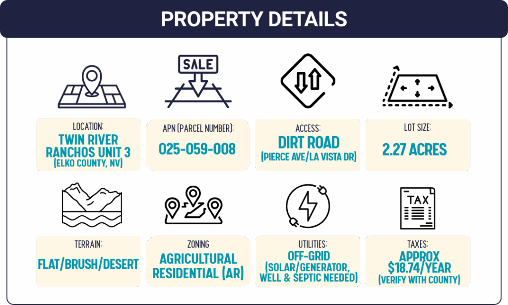 This 2.27-acre parcel sits in Twin River Ranchos Unit 3, just outside Elko. The land is flat and open with desert brush and easy dirt-road access from Pierce Ave and La Vista Dr. No HOA, simple zoning, and very low taxes make this a solid off-grid or long-term hold property.