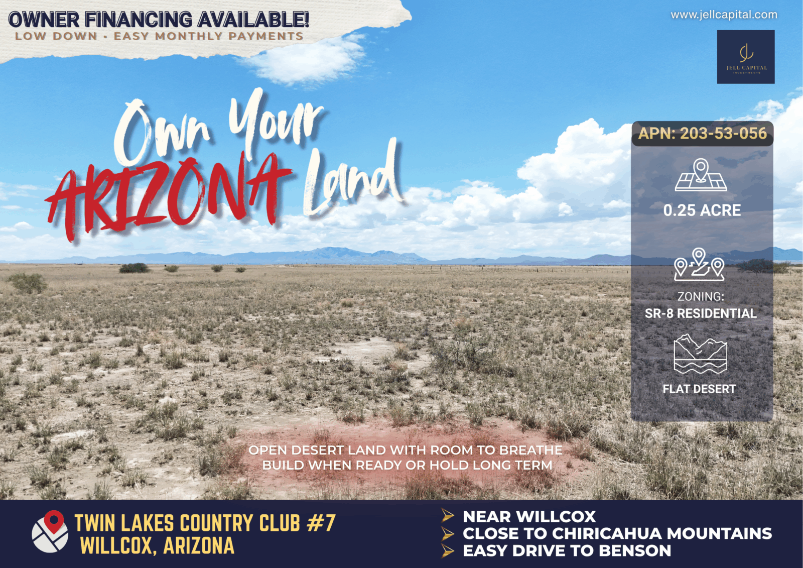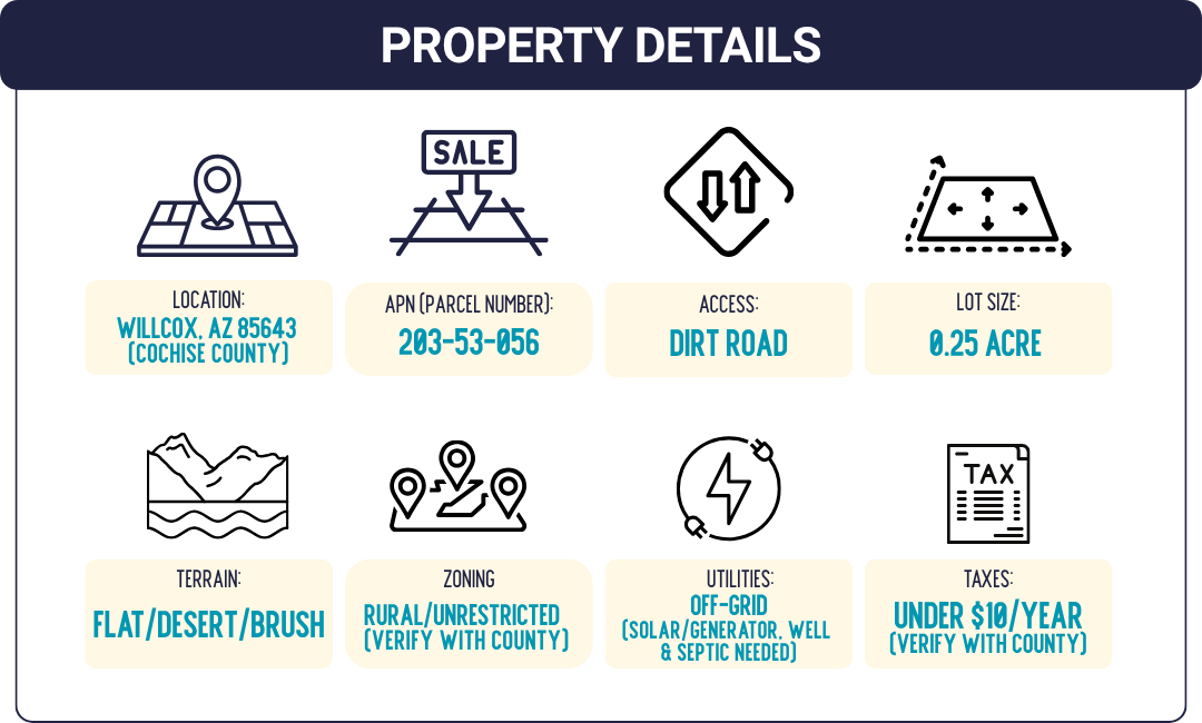 This 0.25-acre lot gives you an easy and affordable way to own land in the Willcox area. The land is flat, quiet, and simple to maintain. No HOA, low taxes, and tiny homes are allowed. Good entry-level lot for future plans or long-term holding with almost no carrying cost.