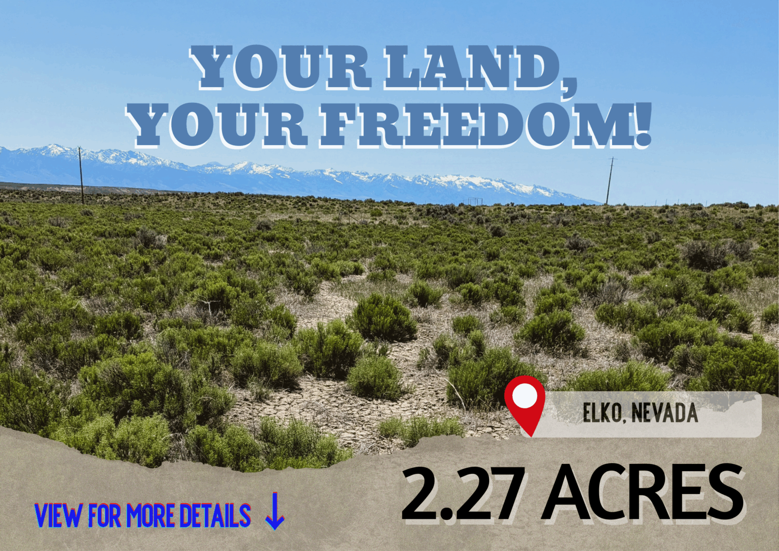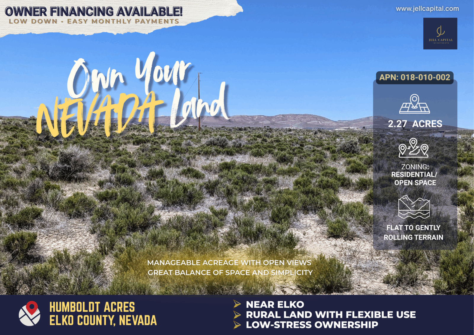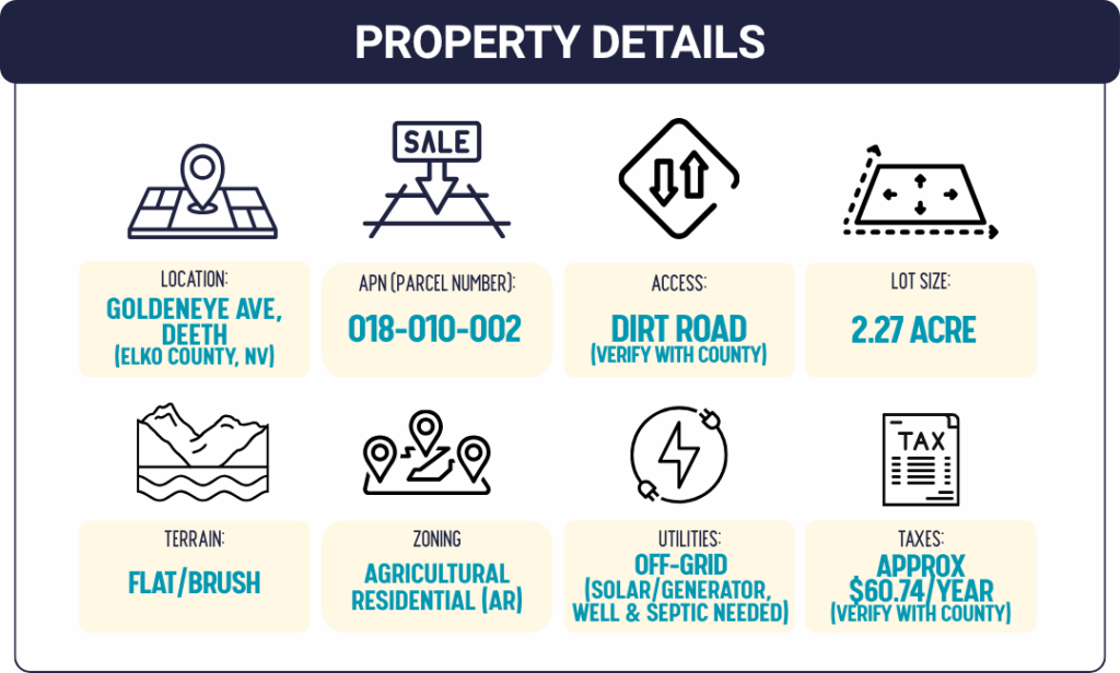 This 2.27-acre parcel sits in Humboldt Acres Unit 1, outside Deeth, NV. The land is flat with light desert brush and easy dirt-road access from Goldeneye Ave. There’s no HOA located, taxes stay low, and zoning is flexible under Agricultural Residential (AR), making it good for RV use, camping, building, or long-term holding.